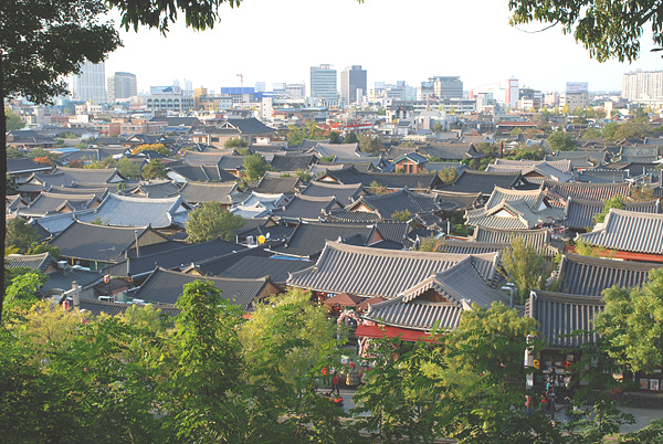 한옥마을의 지붕이 주는 아름답고 우아한 분위기를 확인하고 싶으면 오목대(梧木臺)에 오르면 된다. 오목대는 이성계가 고려 말엽인 1380년, 황산에서 왜구를 토벌하고 개경으로 돌아가던 도중 승전 연회를 베풀었던 곳인데, 지금은 누대 하나와 고종황제가 친필로 쓴 비석이 있는 비각 하나가 있는 곳이다. 그곳으로 오르는 길 중간쯤에 한옥마을을 조망할 수 있는 전망대가 있다. 관광객들은 이곳에서 한옥마을의 우아한 지붕곡선들을 배경으로 사진촬영을 많이 한다.