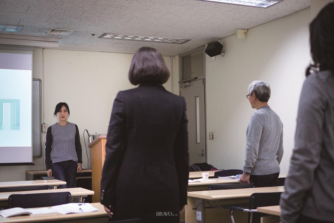 ▲신경원 강사가 싸나톨로지 수업 중 명상을 강의하고 있다.