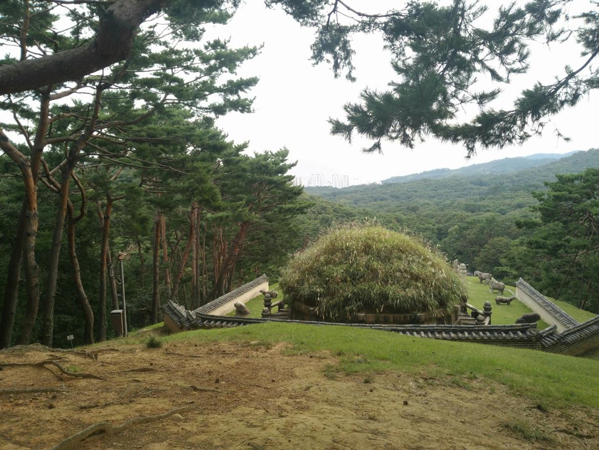 동구릉의 재실을 둘러보고 본격적인 왕릉 답사를 위해 해설사를 따라 건원릉으로 향했다. 해설사는 우리를 능 뒤편의 언덕으로 안내했다. 그곳에서 능을 가운데로 두고 좌우로 산줄기가 뻗어나가고 있었다. 능침(陵寢: 임금의 무덤)의 바로 뒤 언덕에서 바라본 풍경은 앞이 탁 트이고 시원하면서도 아늑한 느낌이었다. 풍수지리라고는 배산임수라는 말밖에 모르는 내가 봐도 좋은 자리라는 것이 느껴졌다.