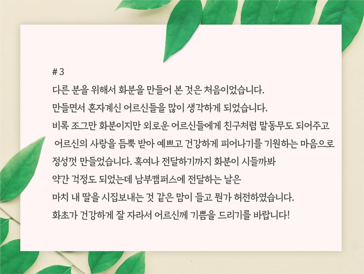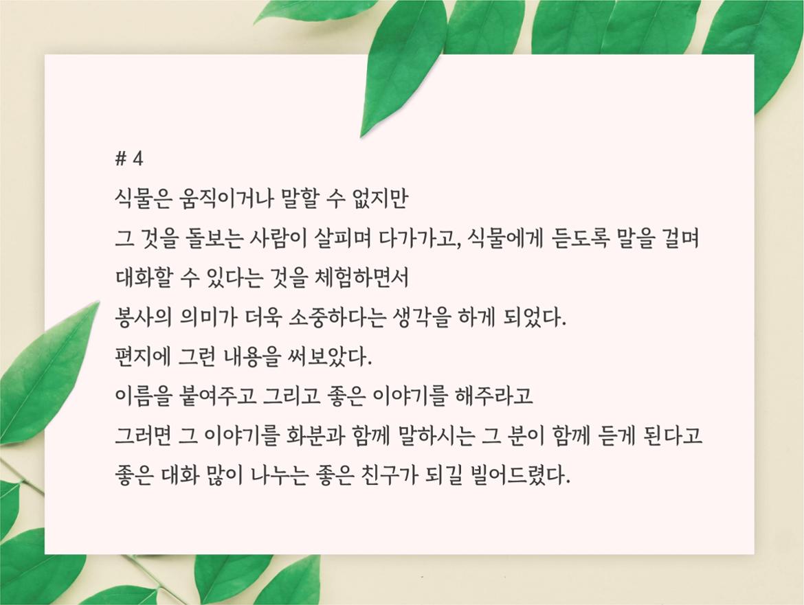 ‘50+작은화분 자원봉사단’도 활동일지 제출 미션이 있었는데요. 가슴 따뜻하고 감동적인 후기들을 살짝 보여드릴게요!