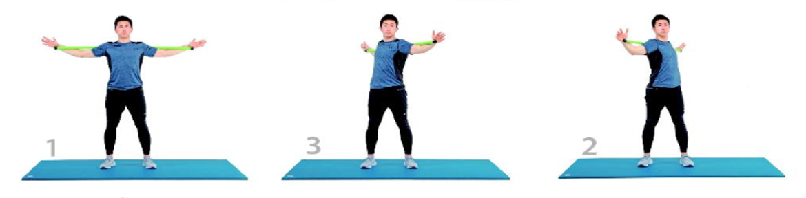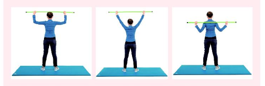 그다음 운동은 몸통 회전이다.(그림4) 양팔을 벌려 어깨 뒤에 스트레칭 봉을 두고 머리가 움직이지 않을 만큼 몸통회전을 한다. 양쪽을 10회 반복한다. 이 운동은 늑골의 운동성을 좋게 해 호흡률을 높이고 팔올림 동작에서 팔과 몸통에 연결된 근육을 스트레칭해 움직임을 향상시킨다.