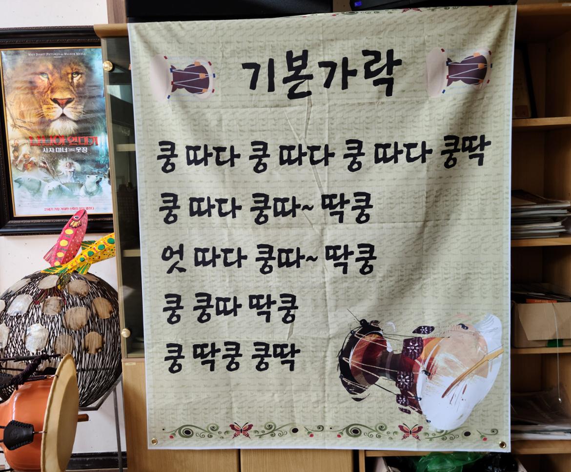장구 연습을 위해 걸어둔 기본 가락이 인쇄된 현수막