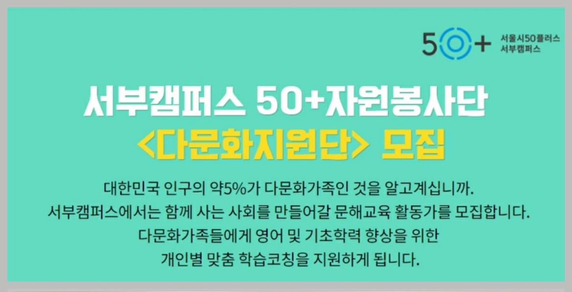 서울시50플러스 서부캠퍼스는 이주민 사회적협동조합과 함께 다문화가족의 생활 안정화에 기여하고자  50+자원봉사단 <다문화가족지원단>을 운영하고 있습니다. 지원단 활동 기간은 6월부터 11월까지이며, 지역 내 다문화가족을 대상으로 다양한 기초학력 향상 교육과 돌봄 프로그램을 지원합니다.