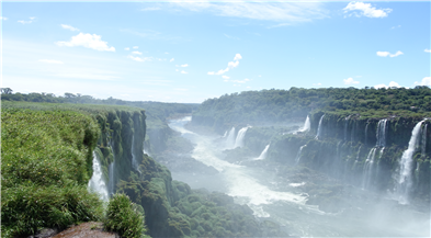 나무로 된 통로를 한참 걸어가니 아스라이 물소리가 들려왔다. 폭포가 곧 나타나리라는 기대에 발걸음이 급해졌다. 멀리 보이는 폭포, 장관이라는 말이 아깝지 않다. 파란 하늘과 초록이 무성한 풀과 나무들, 하얗게 쏟아지는 물줄기. 부서져 흘러내리는 옥빛 물. 제주도의 정방 폭포도 설악산의 토왕성 폭포도 아름답지만 이과수 폭포에는 비길 수 없다.