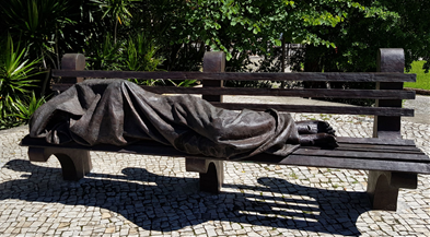 성당 앞에는 금속을 검게 처리한 노숙자 예수 조각상이 있다. 담요를 뒤집어쓰고 벤치에 모로 누워있는 예수상이 마치 리우의 상징 같았다. 낮에도 밤에도 거리에 쓰러져 잠든 사람을 볼 수 있다. 코로나 19 때문에 일자리를 잃고 걸어서 고향으로 돌아가는 수많은 사람들. 예수님이 이 시대에 계신다면 풍찬노숙하는 그들과 함께 하시지 않을까? 캐나다 조각가 티모시 슈발츠가 자선에 대한 영감을 주기 위해 2013년 만들었다. 로마 교황청을 비롯해 전 세계 100여 곳에 있는데 서울에는 2019년 6월 서대문 역사공원에 설치되었다.