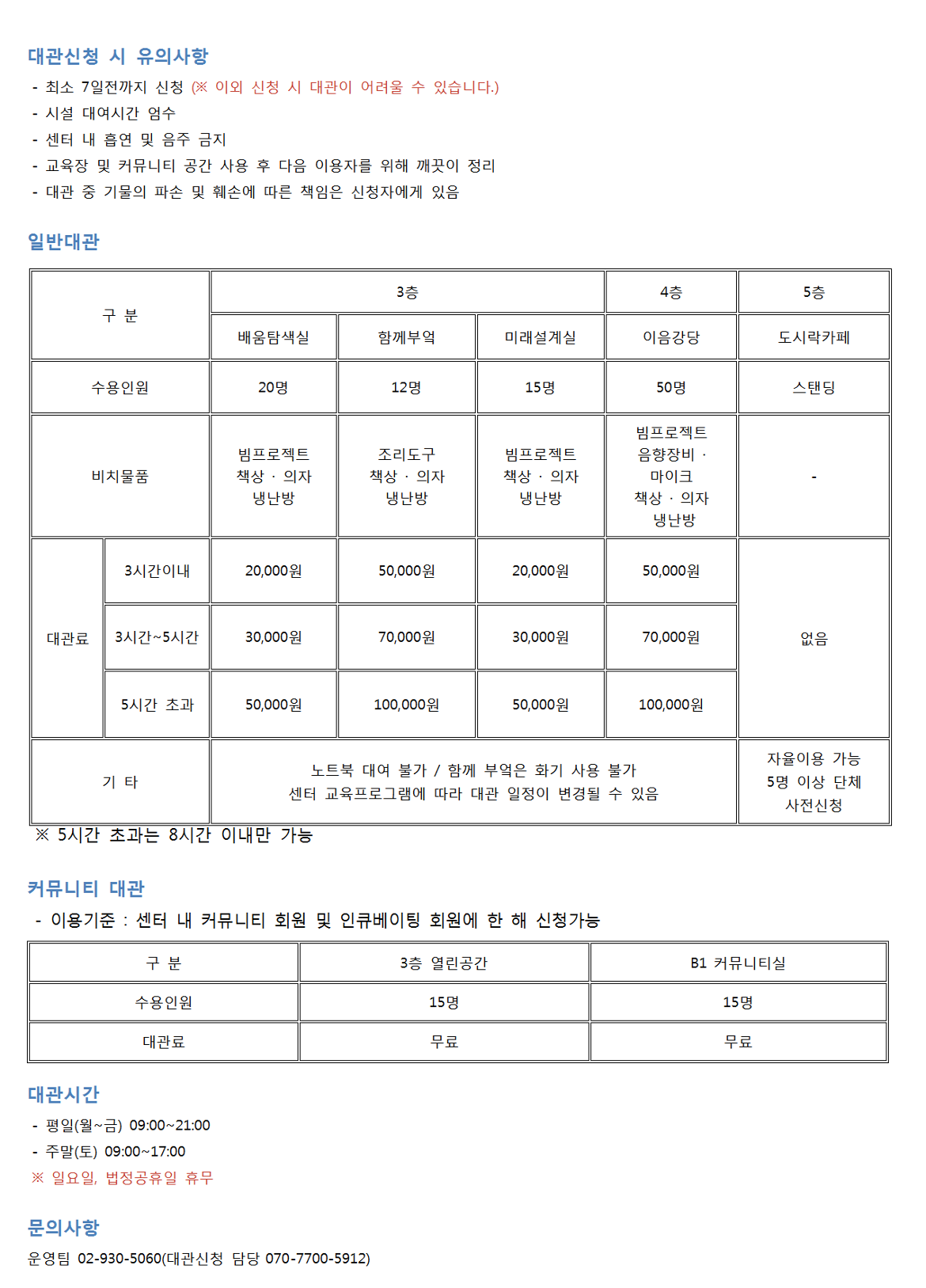 * 상세한 대관 비용 및 옵션등은 해당 기관으로 문의 부탁드립니다.