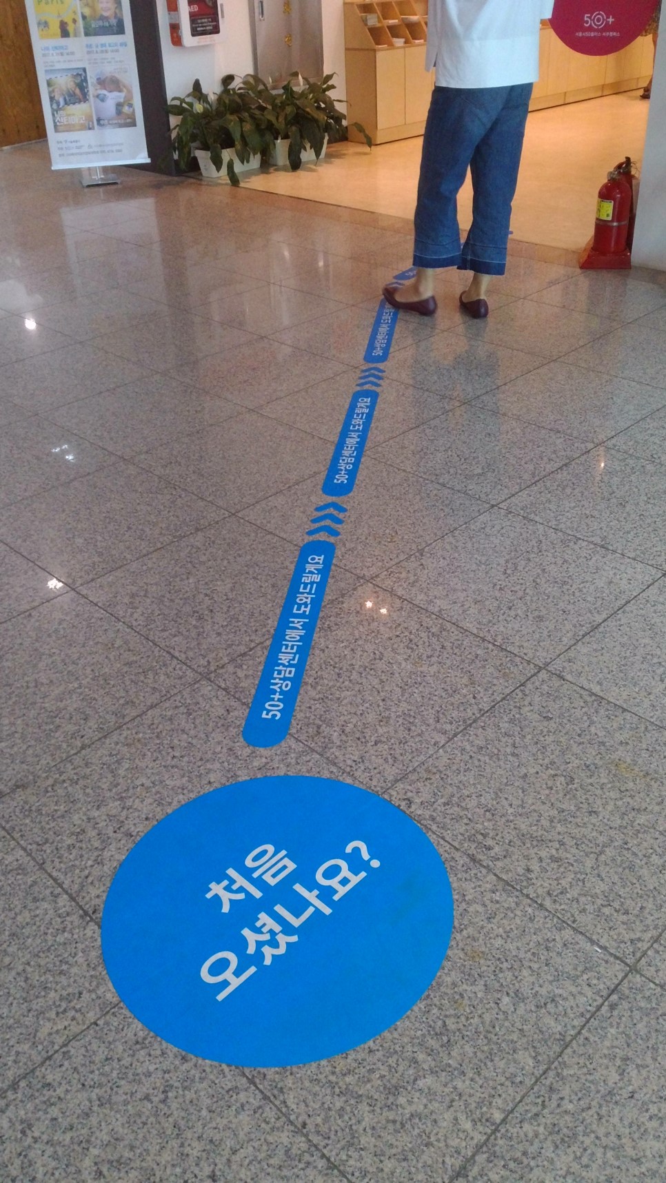 그럴 때 오아시스처럼 눈에 번쩍 띄는 바닥의 파란색 가이드, “처음 오셨나요?” 를 따라 가자. 몇 걸음만에 '50+상담센터' 앞에