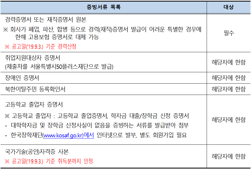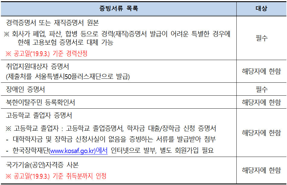 • 서류전형 합격자가 정해진 기일 내에 증빙서류(경력증명서, 가산점 증빙서류, 자격증 사본 등) 등록