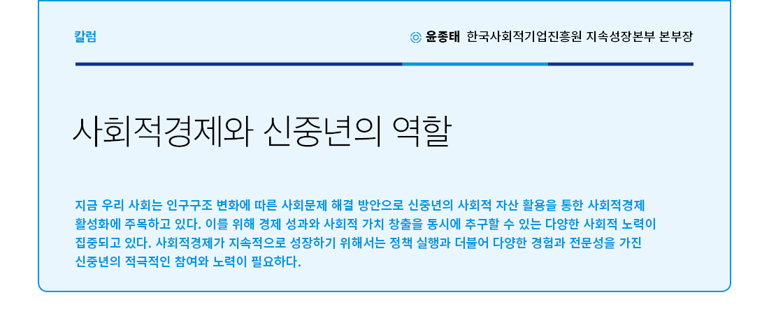그간 현장과 많은 전문가들이 논의해 온 바와 같이 사회적경제가 지속적으로 성장하여 사회적 가치를 창출하기 위해서는 ‘사람’을 키우는 것이 가장 중요하다고 본다. 이런 점에서 열정과 꿈, 전문성과 경험을 지닌 신중년들이 사회적 경제 분야로 진출하여 제2의 인생을 펼치는 보람을 얻고, 이를 통해 사회적 경제가 활성화되어 우리사회의 문제 해결과 따뜻한 성장에 크게 이바지하는 것은 얼마나 이상적이고 아름다운 일일 것인가.