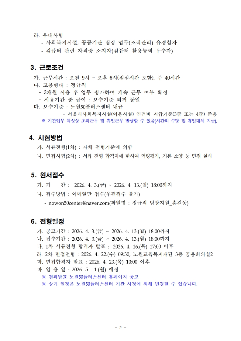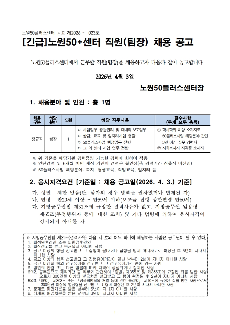 서울시 노원센터 | [긴급]노원50플러스센터 직원(팀장) 채용 공고