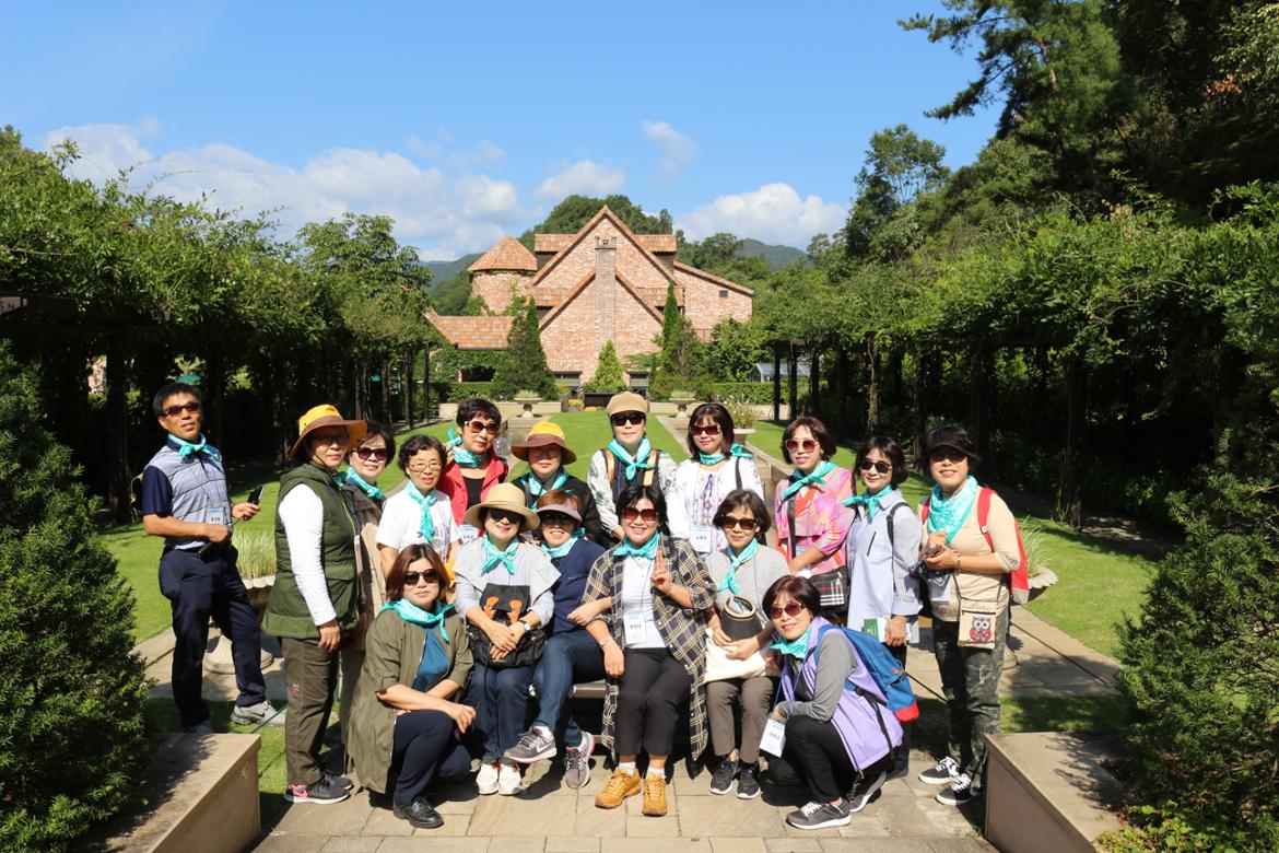 숲속 길을 걷는 50+ 학생들의 행복한 웃음소리에