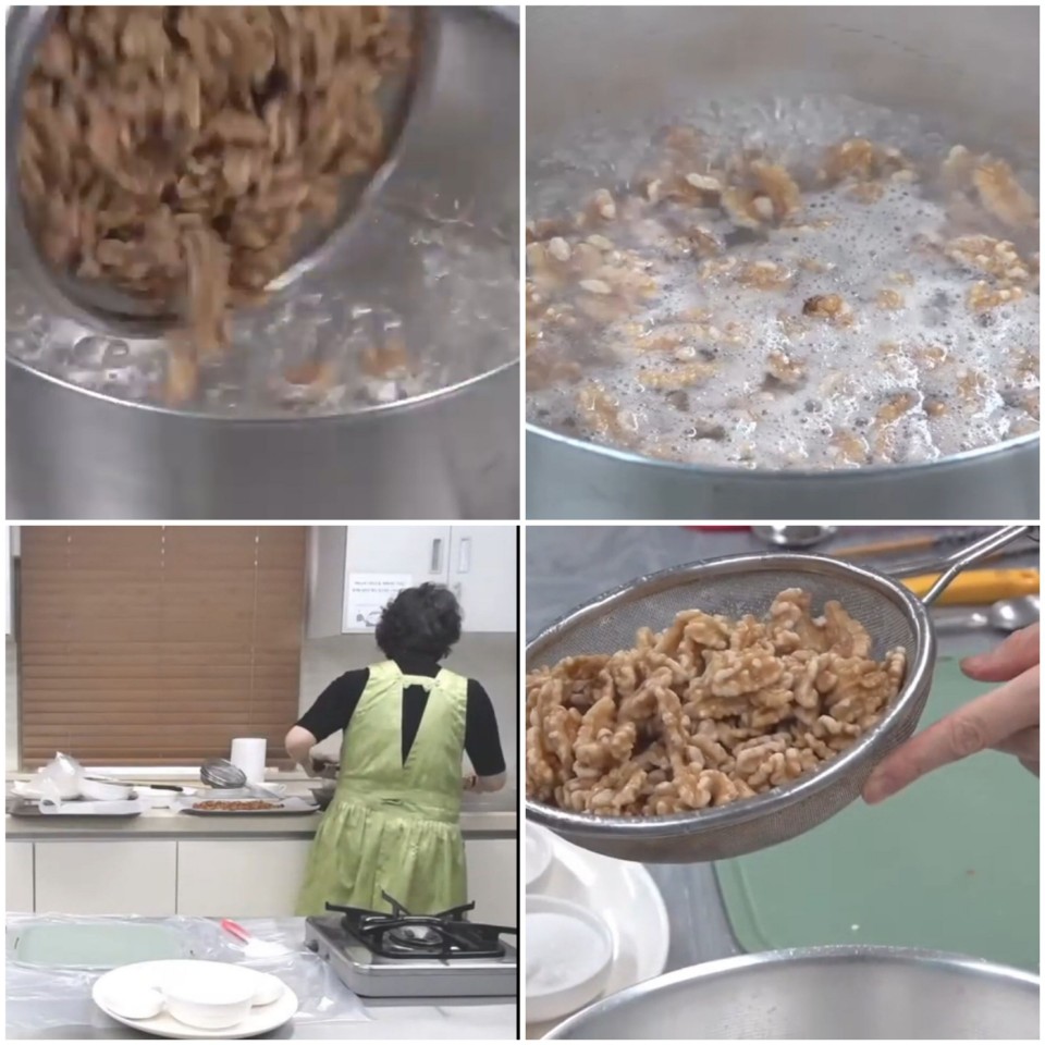 2. 끓는물에 호두를 3분 삶아요. 지저분한 거품과 가루도 제거하고 떪은 맛도 제거하기 위해서입니다.