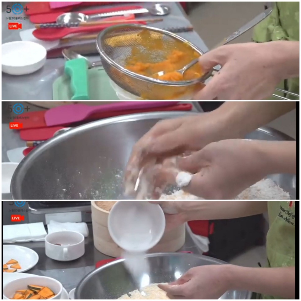 2. 껍질을 벗긴 후 찜통에 살짝 찐 단호박을 채에 내려 반죽에 섞어줍니다.