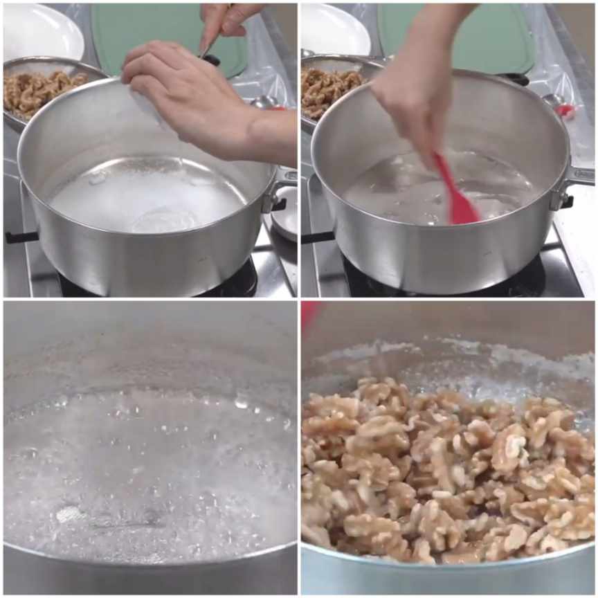 5. 중불 켜고 호두 넣고 저어주면서 실이 보일때까지 졸여줍니다.