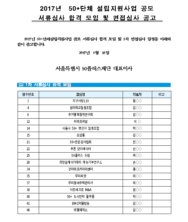 2017년 50+단체 설립지원사업 공모 서류심사 합격 모임 및 면접심사 공고