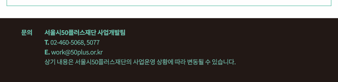 서울특별시 50플러스재단 (우04147)서울시 마포구 백범로31길 21, 1층 사업자등록번호 : 219-82-61209