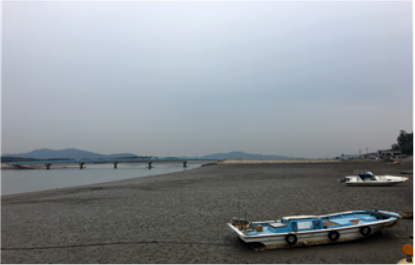신도로 이동하여 회와 매운탕을 먹고 식당 밖을 내다보니 멀리 도망간 바닷물이 가까이 다가와 있다.