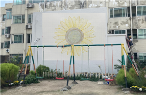 놀이터 그네 뒷면에는 해바라기를 , 도로 쪽  외벽은 홍제천의 자연과 어우러지는 새의 이미지를 형상화 해