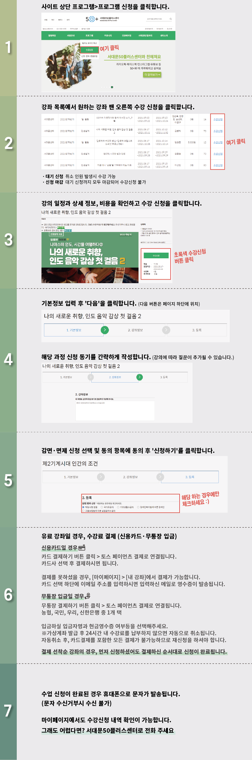 - 모든 수강 신청은 본인 명의만 가능하며, 대리 신청은 불가합니다. - 일부 강좌의 경우, 수강 시기가 달라도 동일인의 중복 참여를 제한할 수 있습니다. - 모집 현황에 따라 접수 일정은 변동될 수 있습니다(조기 마감, 폐강 등). - 강좌 신청 상태는 '마이페이지'에서 확인할 수 있습니다.