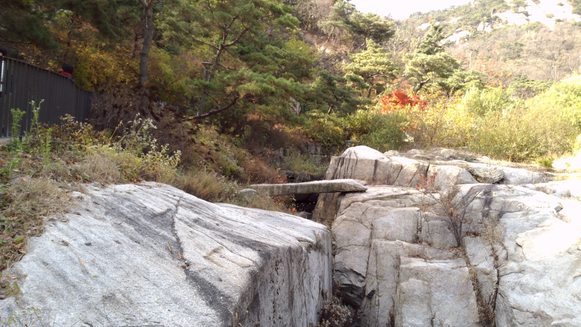 수성동계곡으로 나가 정선의 그림에 나오는 기린교 근처로 다가가자 거대한 바위틈으로 꽤 많은 양의 물이 흘러내린다. 물은 큰 바위 틈에서 아래로 쏟아지는데