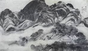 눈앞에 펼쳐진다. 물기를 머금은 듯 검은 빛을 띤 산봉우리와 바위들, 바위 사이로 쏟아져 내리는 작은 폭포, 그림 한켠의 커다란 기와집을 둘러싸고 구름인지