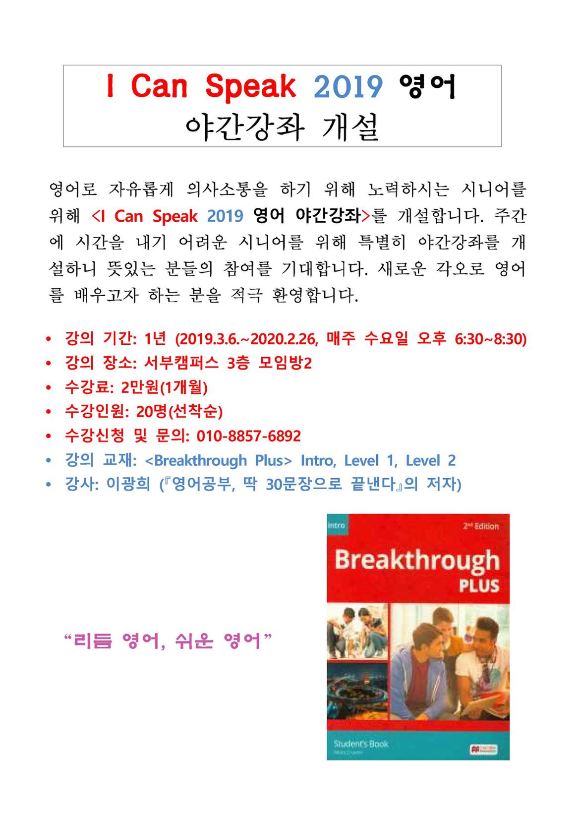 <I Can Spaek 2019> 영어 야간강좌 수강생 모집