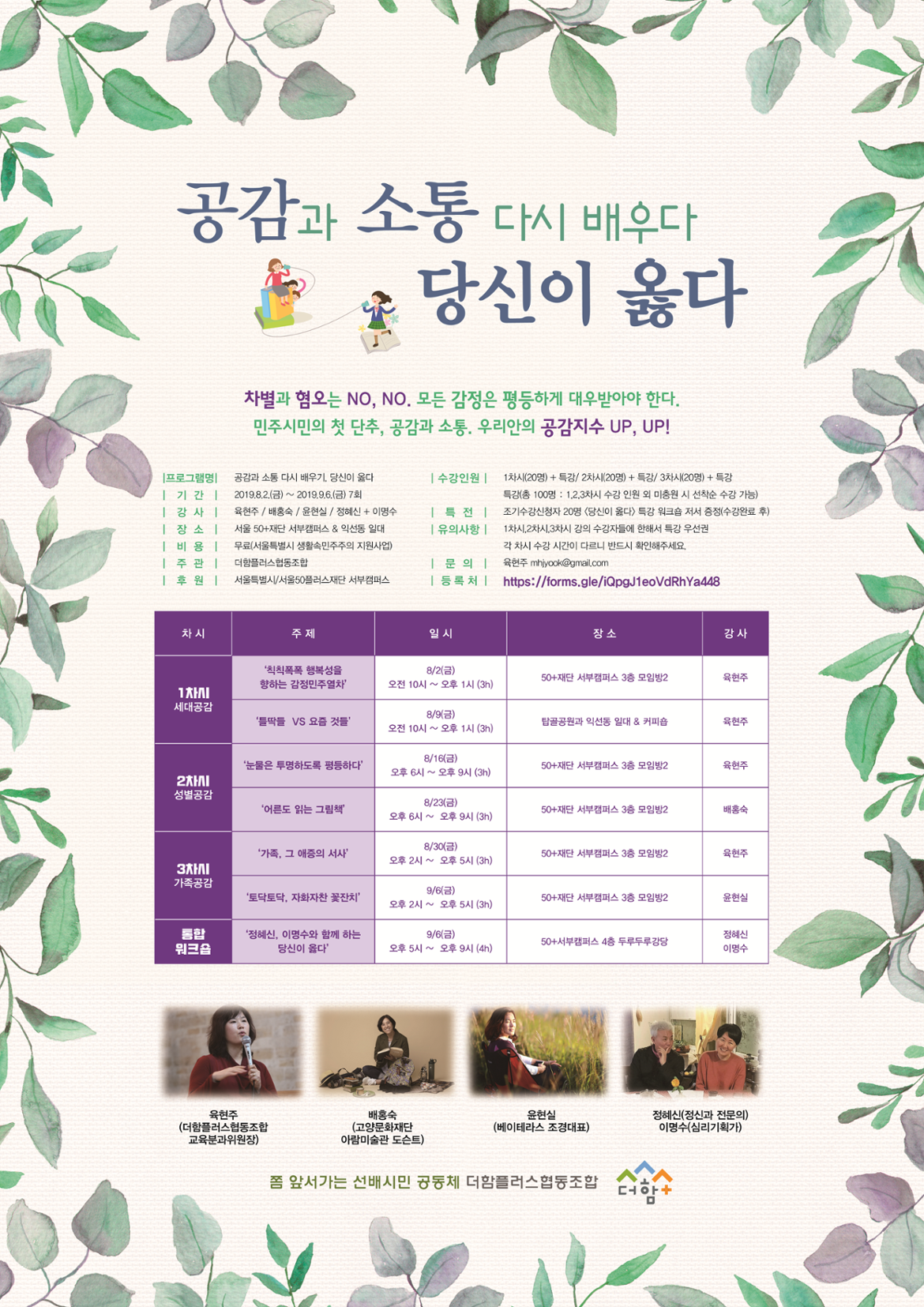 더함플러스 협동조합이 서울시 생활속 민주주의, 50플러스재단 서부캠퍼스와 함께 <공감과 소통 다시 배우다, 당신이 옳다> 프로그램을 진행합니다.
