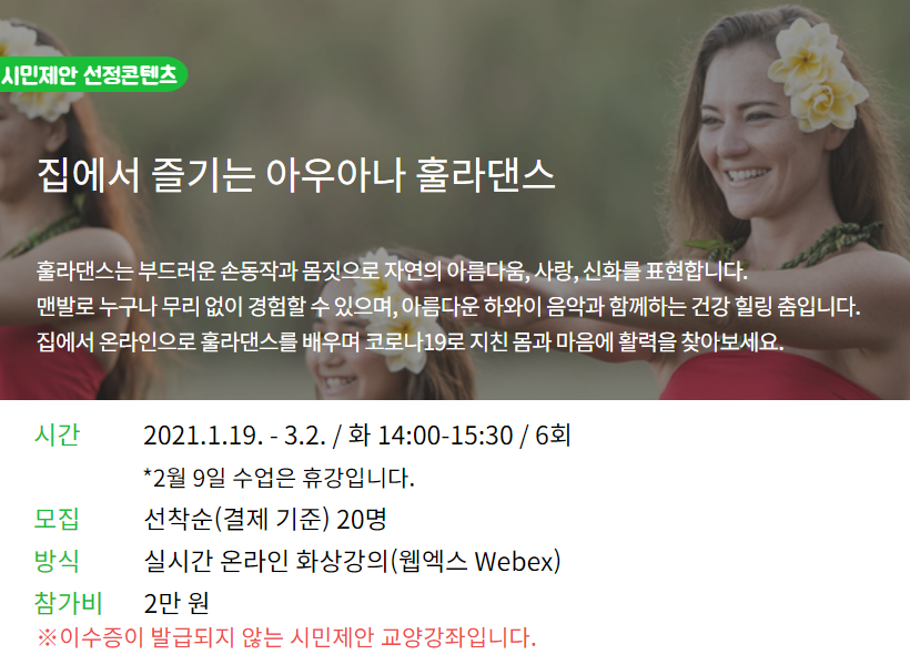 (1 회차) 2021.01.19(14:00 ~ 15:30) 온라인(Webex) 노경희 훌라이야기1- 발동작1과 손동작 배우기 없음