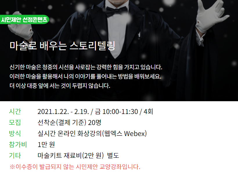 (3 회차) 2021.02.05(10:00 ~ 11:30) 온라인(Webex) 조경애 상황별 마술 연출(매직목걸이) 없음