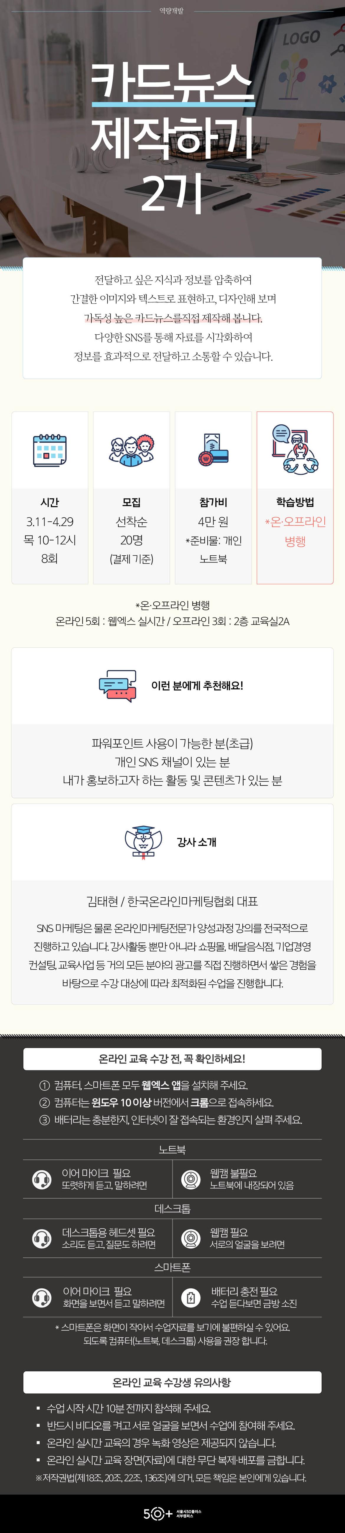 (6 회차) 2021.04.15(10:00 ~ 12:00) 온라인(Webex) 김태현 카드뉴스 제작 실습+(페이스북 채널 활용법) 없음