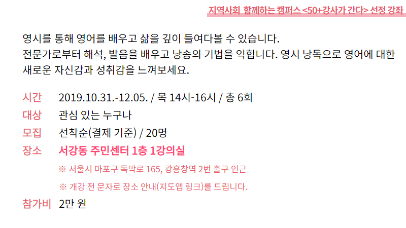 서강동 주민센터 | 정창래 | 영시로 표현하는 나 : 영시 낭송회 | 없음 |