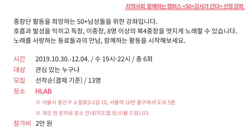HLAB(서울역 인근) | 심재완 | 호흡과 발성, 독창과 중창 | 없음 |