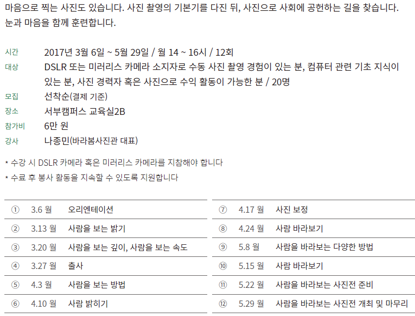 (1 회차) 2017.12.20(14:00 ~ 16:00) 교육실2B 서부캠퍼스 강사진 오리엔테이션 없음