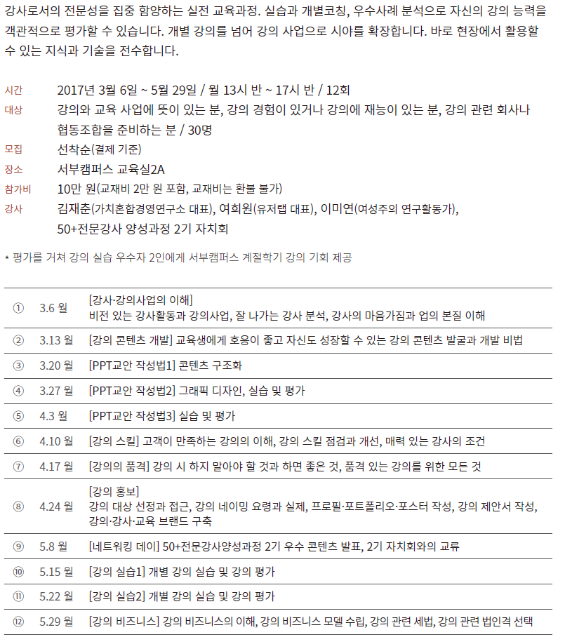 (1 회차) 2017.12.20(13:30 ~ 17:30) 교육실2A 서부캠퍼스 강사진 [강사·강의사업의 이해] 비전 있는 강사활동과 강의사업, 잘 나가는 강사 분석, 강사의 마음가짐과 업의 본질 이해 없음