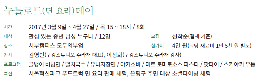 (2 회차) 2017.12.21(15:00 ~ 18:00) 모두의부엌 서부캠퍼스 강사진 누들로드(면 요리)데이: 골뱅이 비빔면 없음
