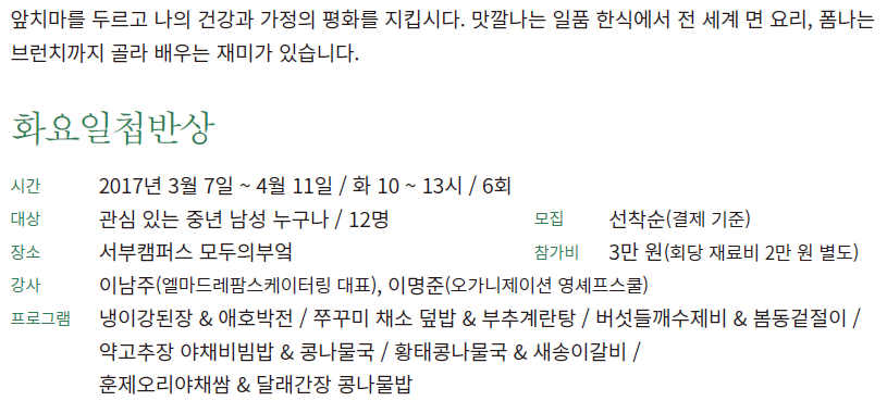 (1 회차) 2017.12.20(10:00 ~ 13:00) 모두의부엌 서부캠퍼스 강사진 화요일첩반상: 냉이강된장 & 애호박전 없음