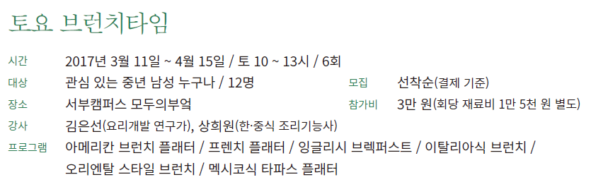 (3 회차) 2017.12.22(10:00 ~ 13:00) 모두의부엌 서부캠퍼스 강사진 토요 브런치타임: 아메리칸 브런치 플래터 없음