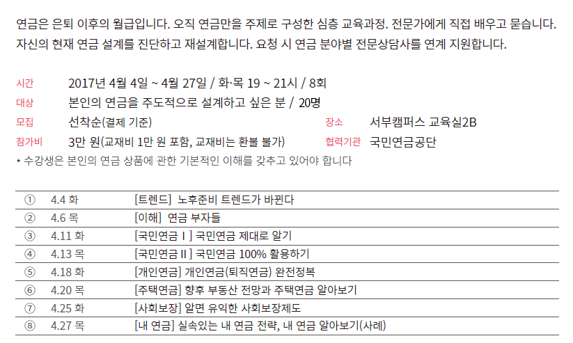 (1 회차) 2017.12.20(19:00 ~ 21:00) 교육실2B 서부캠퍼스 강사진 [트렌드] 노후준비 트렌드가 바뀐다 없음