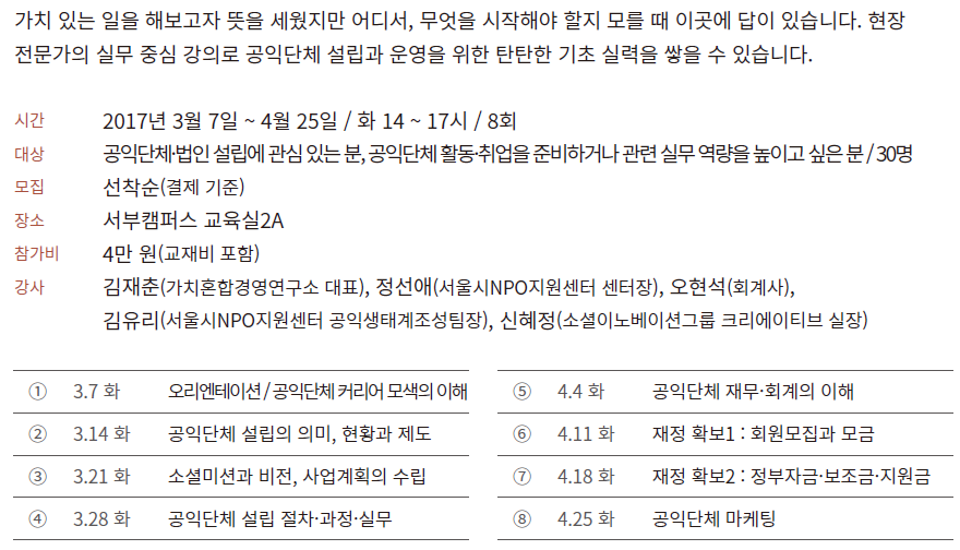 (1 회차) 2017.12.21(14:00 ~ 17:00) 교육실2A 서부캠퍼스 강사진 오리엔테이션 / 공익단체 커리어 모색의 이해 없음