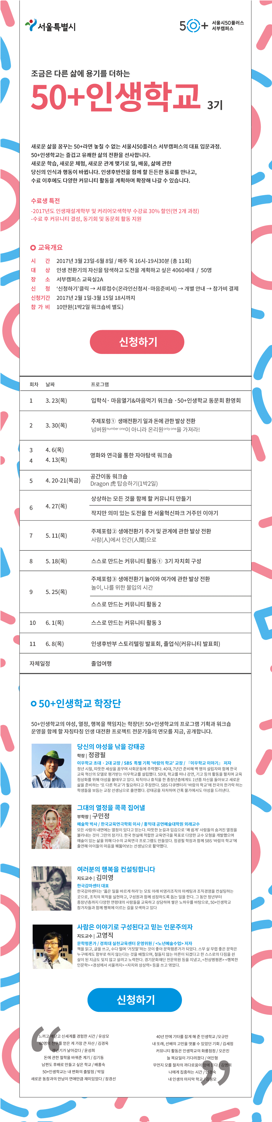 (1 회차) 2017.12.24(16:00 ~ 19:30) 교육실2A 서부캠퍼스 강사진 입학식 / 마음열기&마음먹기 워크숍 / 50+인생학교 동문회 환영회 없음