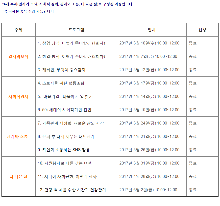 (1 회차) 2017.12.21(10:00 ~ 12:00) 교육실2C 서부캠퍼스 강사진 일자리모색: 1. 창업·창직, 어떻게 준비할까 (1회차) 없음