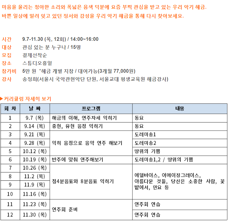 세종문화회관 문화예술학교: 해금교실 (초급)