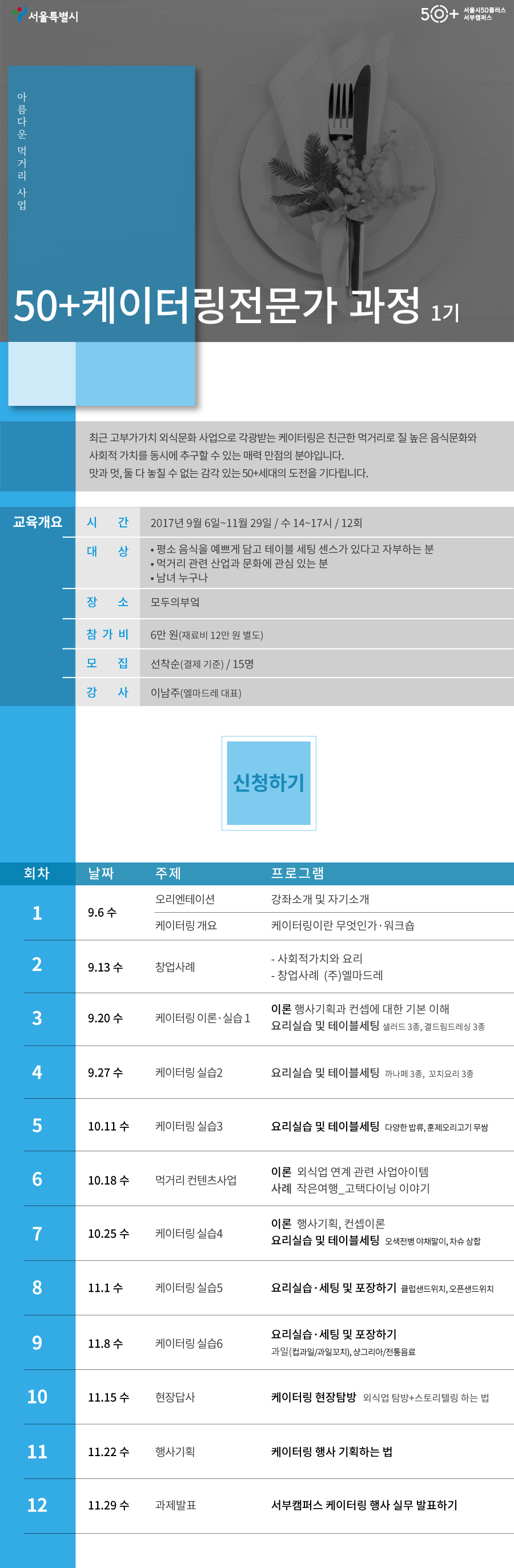 (1 회차) 2017.12.22(14:00 ~ 17:00) 모두의부엌 서부캠퍼스 강사진 오리엔테이션: 강좌소개 및 자기소개 / 케이터링 개요: 케이터링이란 무엇인가·워크숍 없음