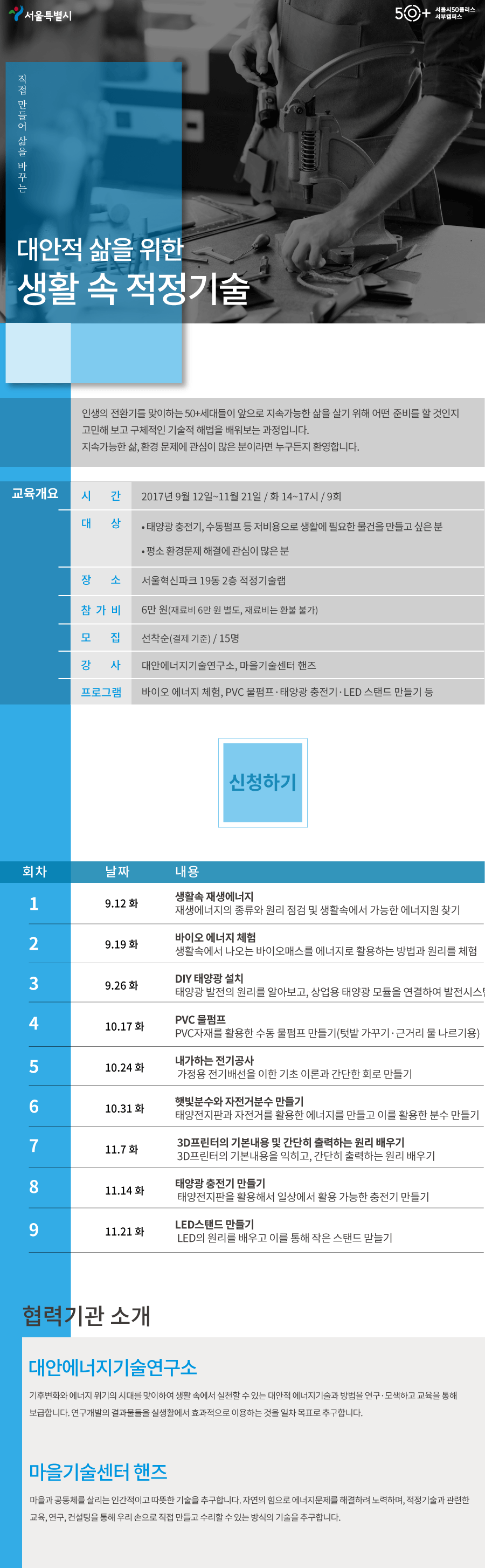 (1 회차) 2017.12.22(14:00 ~ 17:00) 서울혁신파크 19동 2층 적정기술랩 서부캠퍼스 강사진 생활속 재생에너지: 재생에너지의 종류와 원리 점검 및 생활속에서 가능한 에너지원 찾기 없음