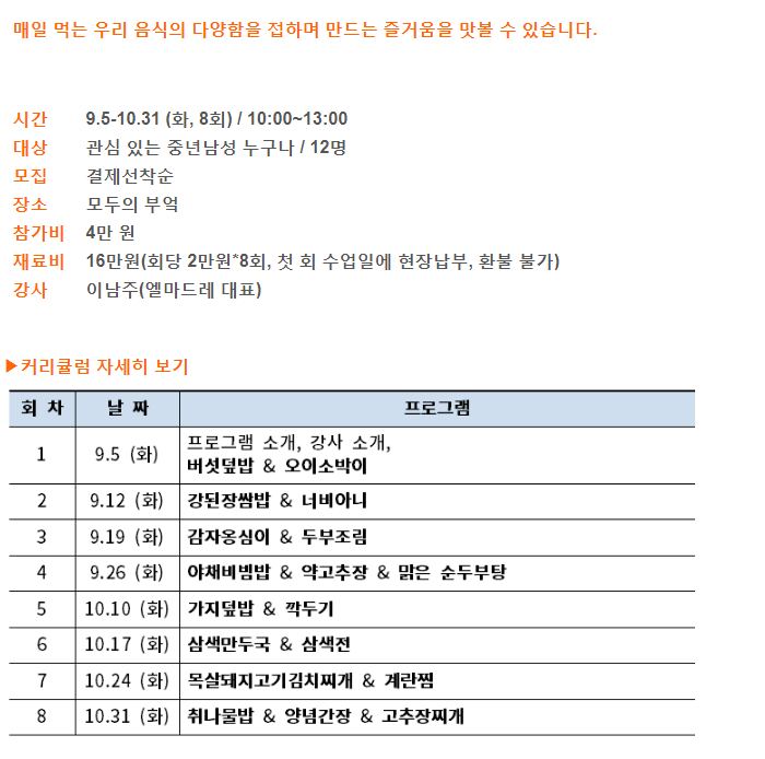 재료비 16만원(회당 2만원*8회, 첫 회 수업일에 현장납부, 환불 불가)