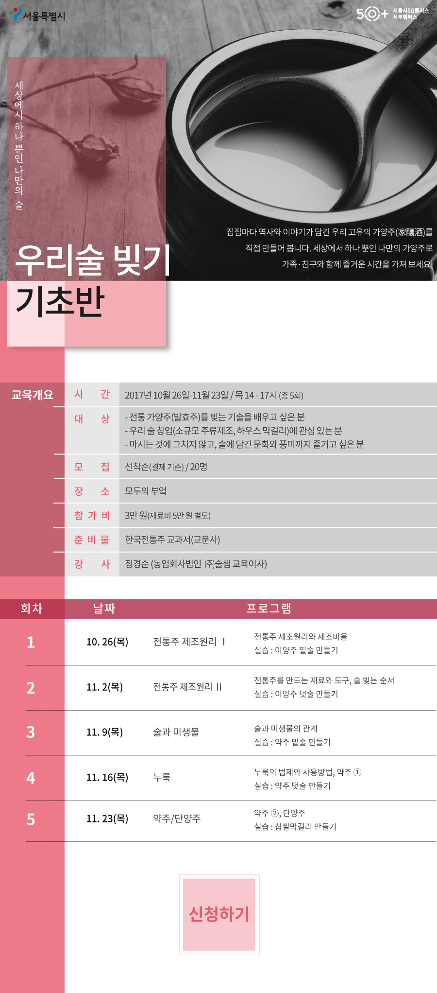 (1 회차) 2017.12.23(14:00 ~ 17:00) 모두의부엌 서부캠퍼스 강사진 전통주 제조원리 Ⅰ: 전통주 제조원리와 제조비율 / 실습: 이양주 밑술 만들기 없음