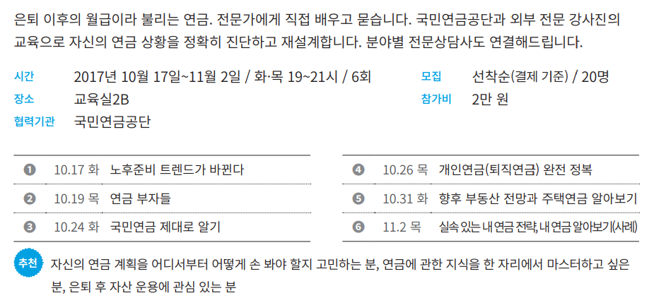 (1 회차) 2017.12.25(19:00 ~ 21:00) 교육실2B 서부캠퍼스 강사진 노후준비 트렌드가 바뀐다 없음