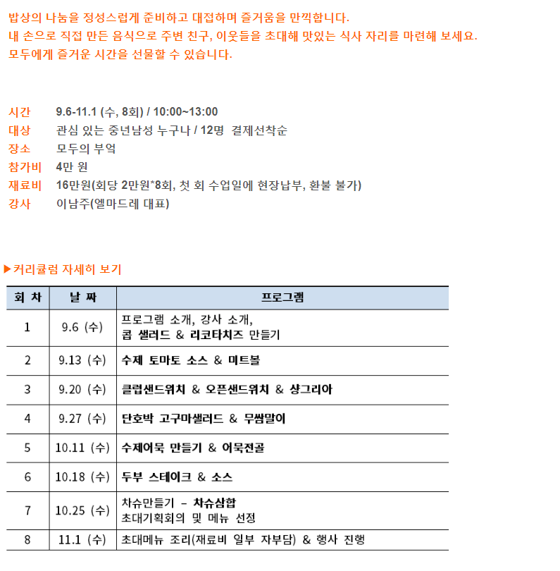 재료비 16만원(회당 2만원*8회, 첫 회 수업일에 현장납부, 환불 불가)