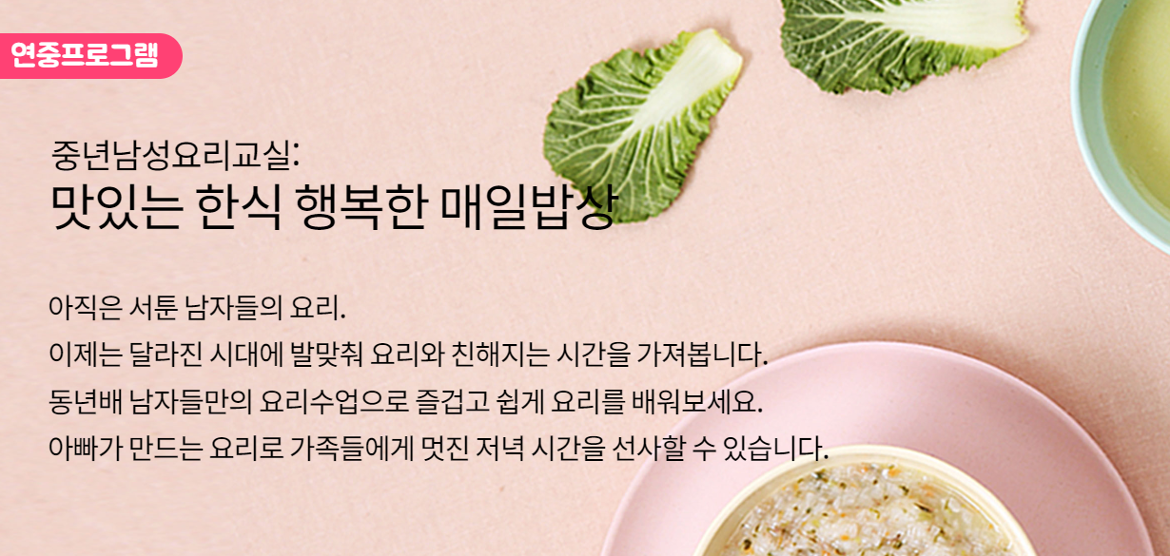 추천     요리에 서툴거나 동년배와 편한 환경에서 요리를 배우고 싶은 중년 남성