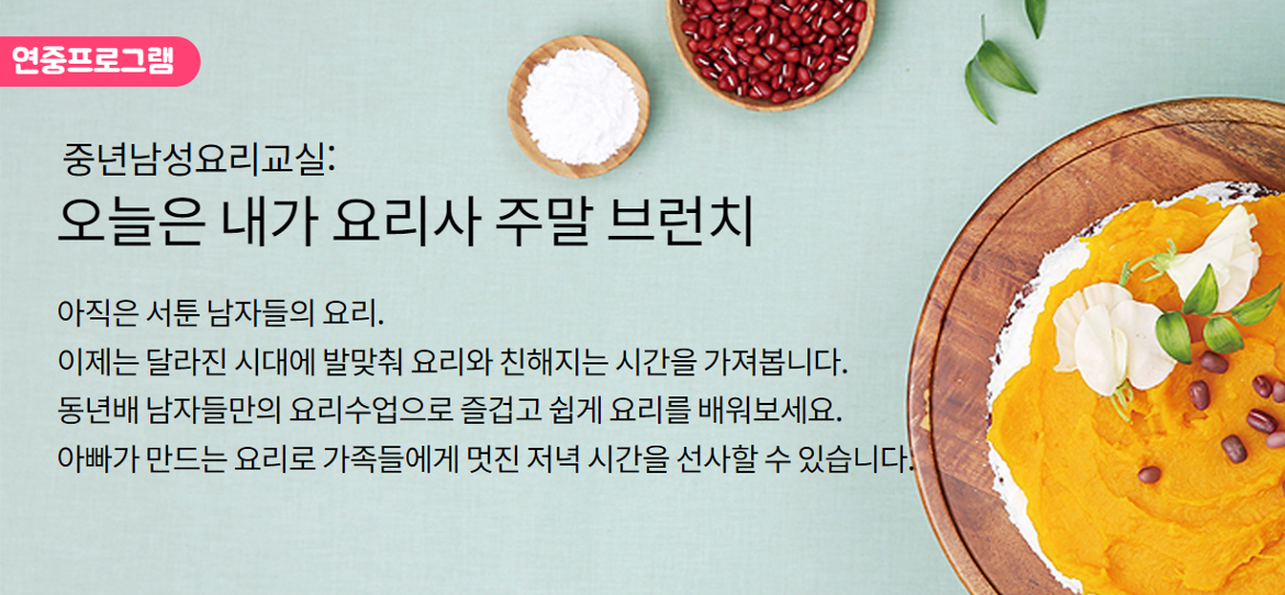 '중년남성요리교실: 오늘은 내가 요리사 주말 브런치' 과정은 32() 09시부터 신청 가능합니다.
